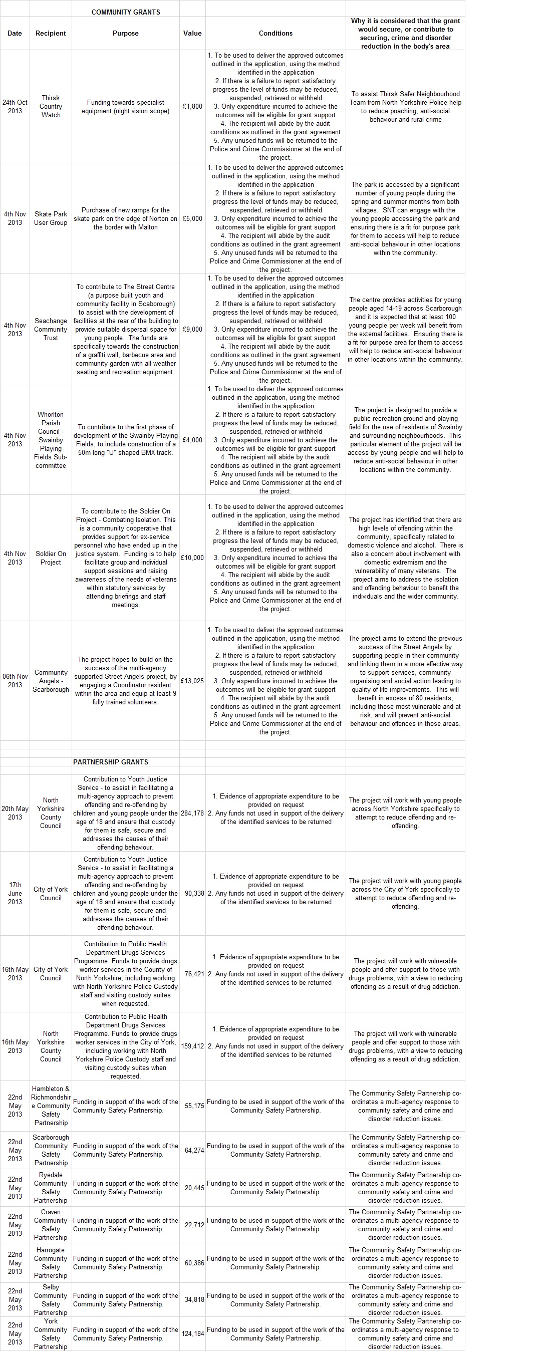 - I have interpreted your request as relating to payments made to partners, either by way of a community grant or a partnership grant. Details of all such payments are available via the following link: https://northyorkshire-pfcc.mixd.co.uk/wp-content/uploads/2016/10/Grants-information.jpgYou will note that there are contributions made to the Public Health Department Drugs Services Programme for North Yorkshire and the City of York.
